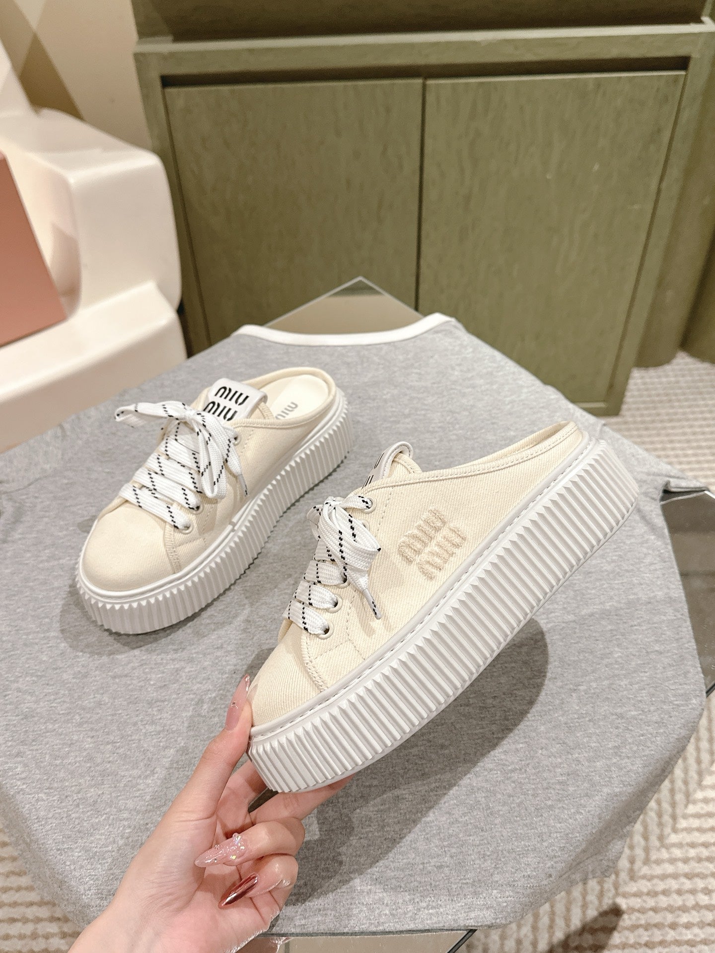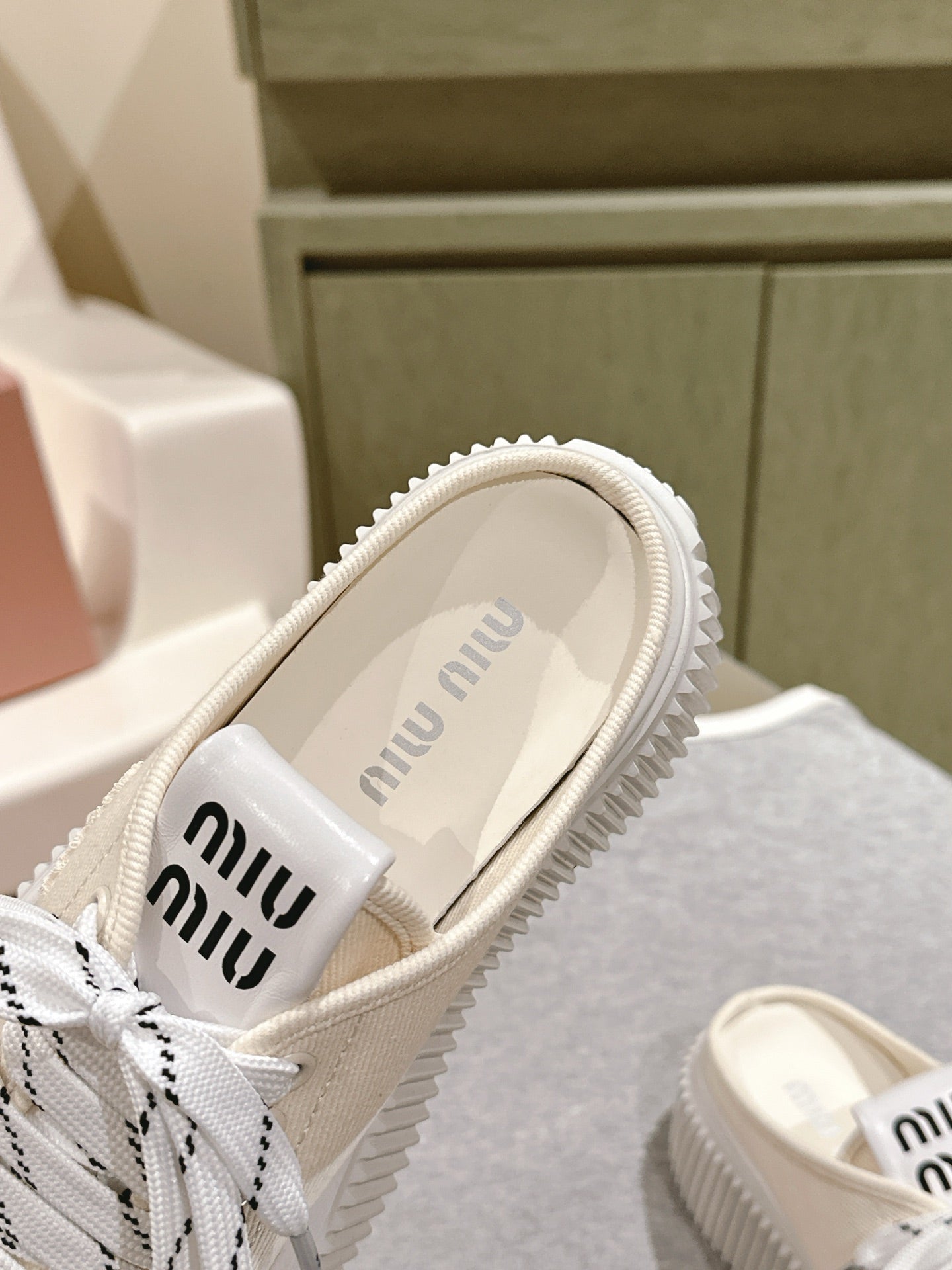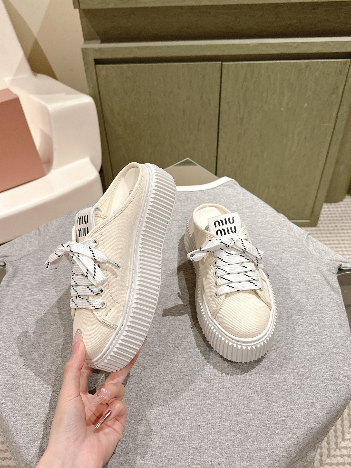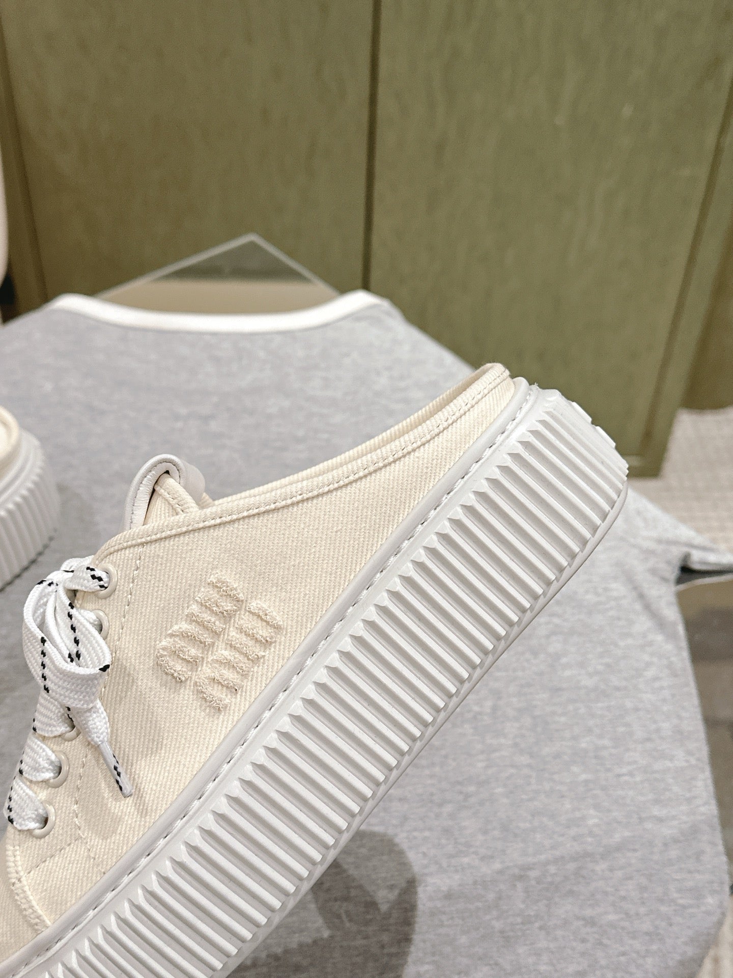 Miu Miu Biscuit Shoes Platform Mules Cream Denim Canvas 532871