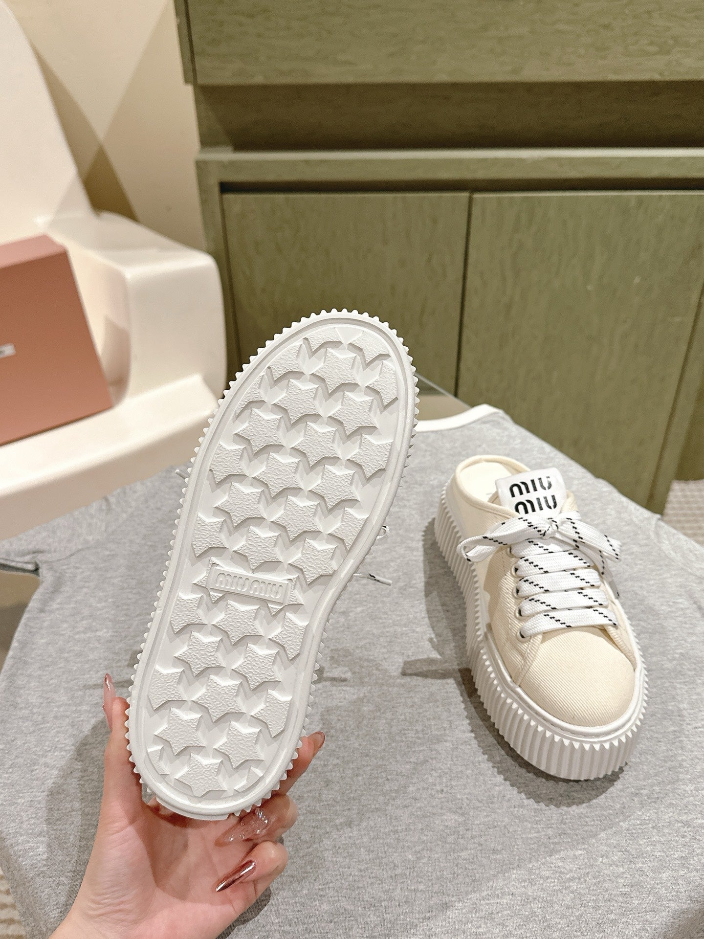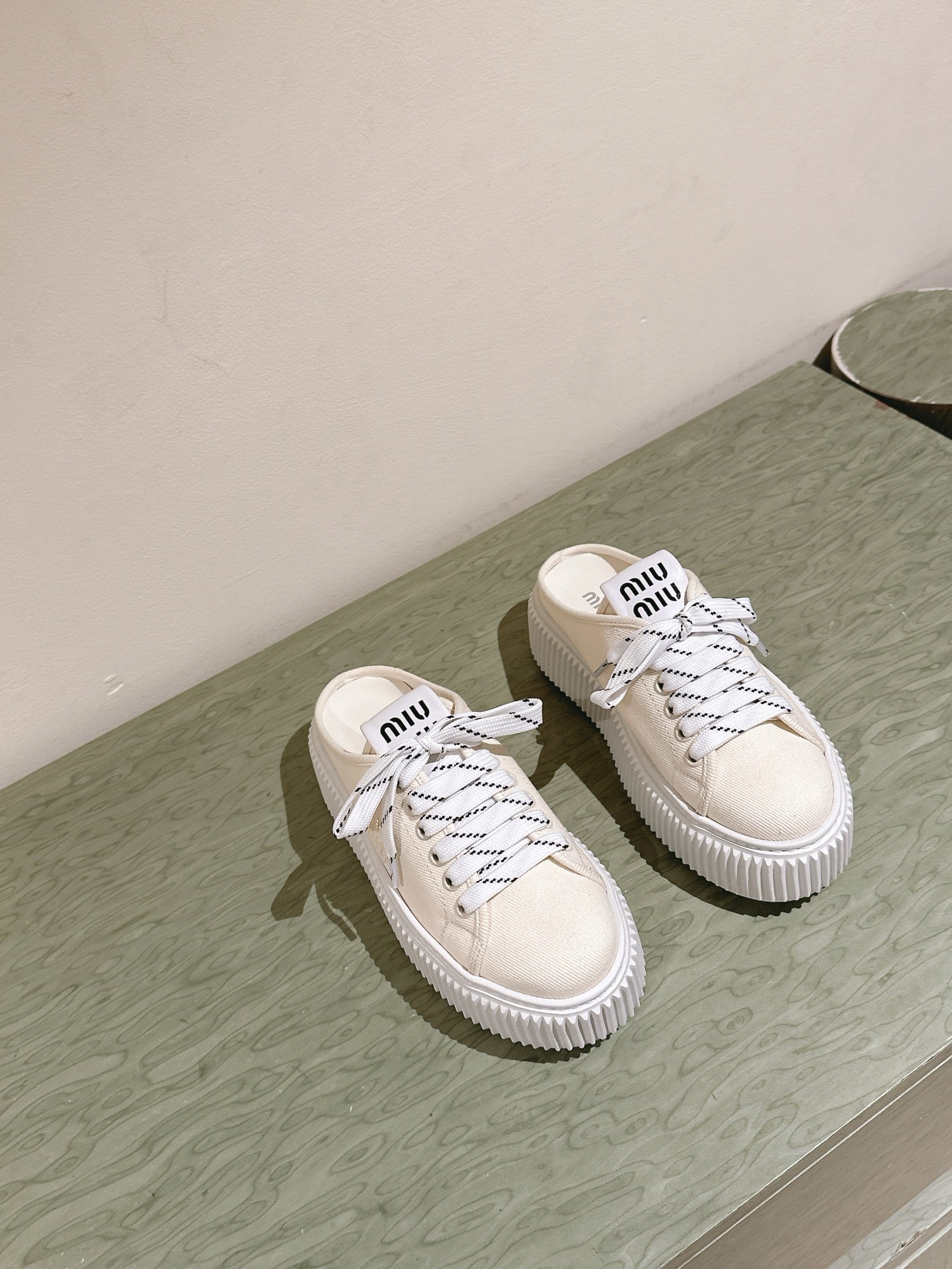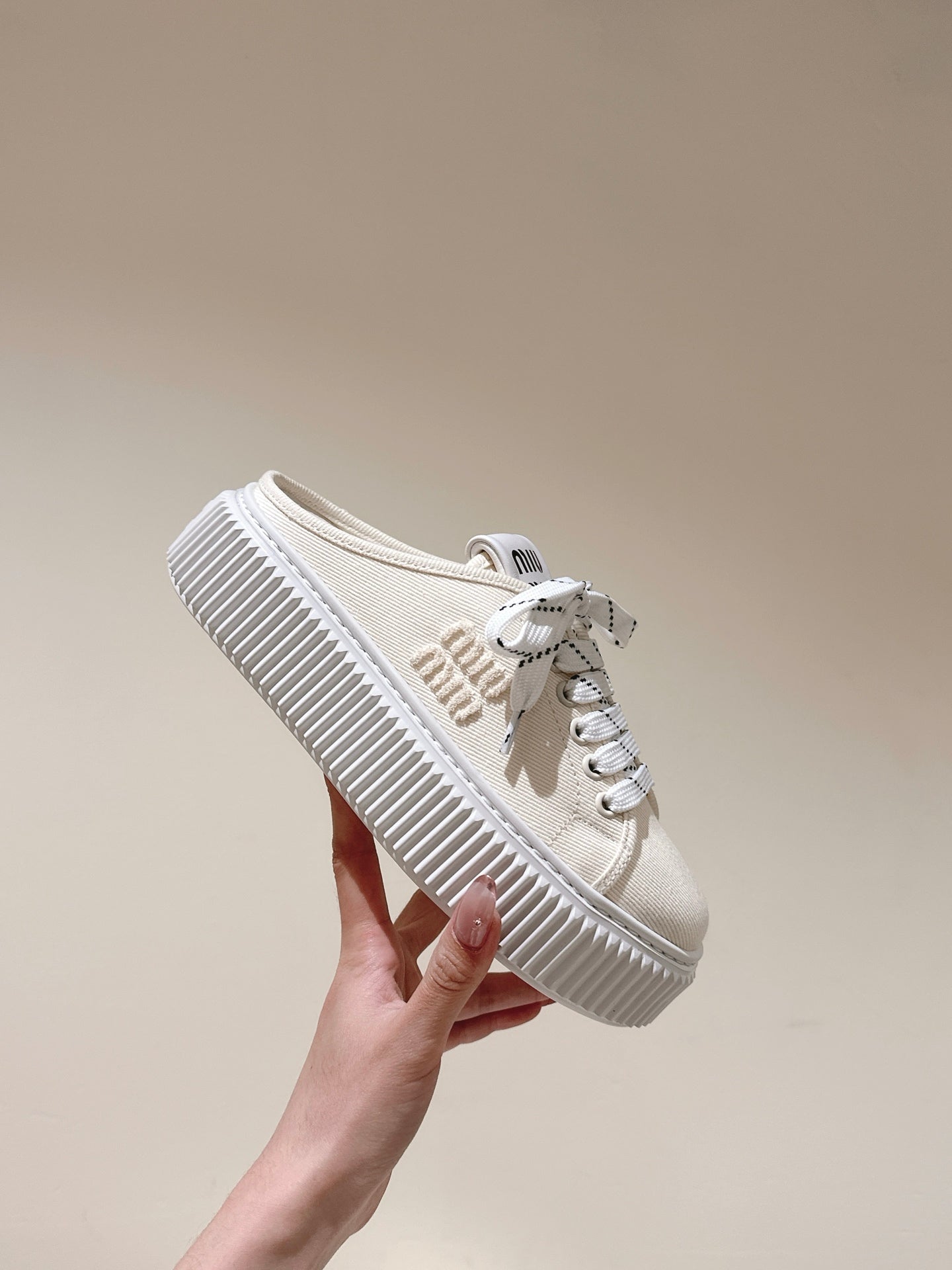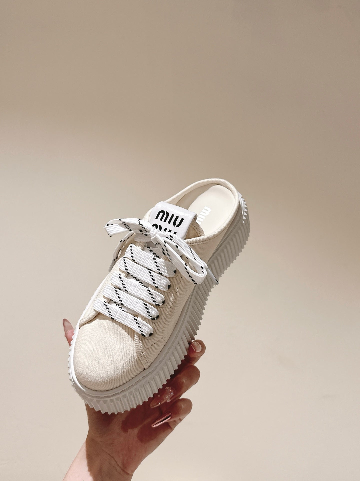 Miu Miu Biscuit Shoes Platform Mules Cream Denim Canvas 532871