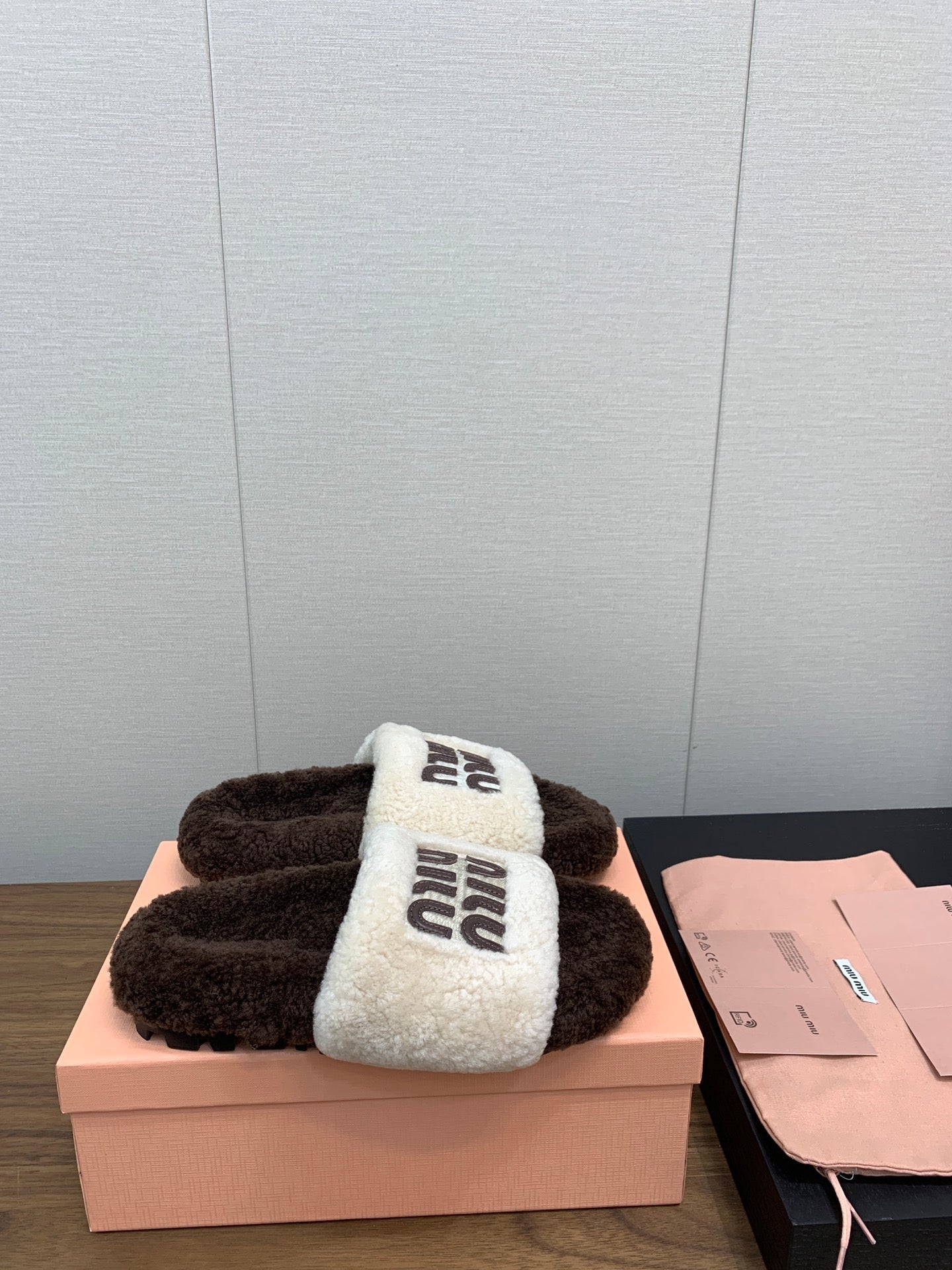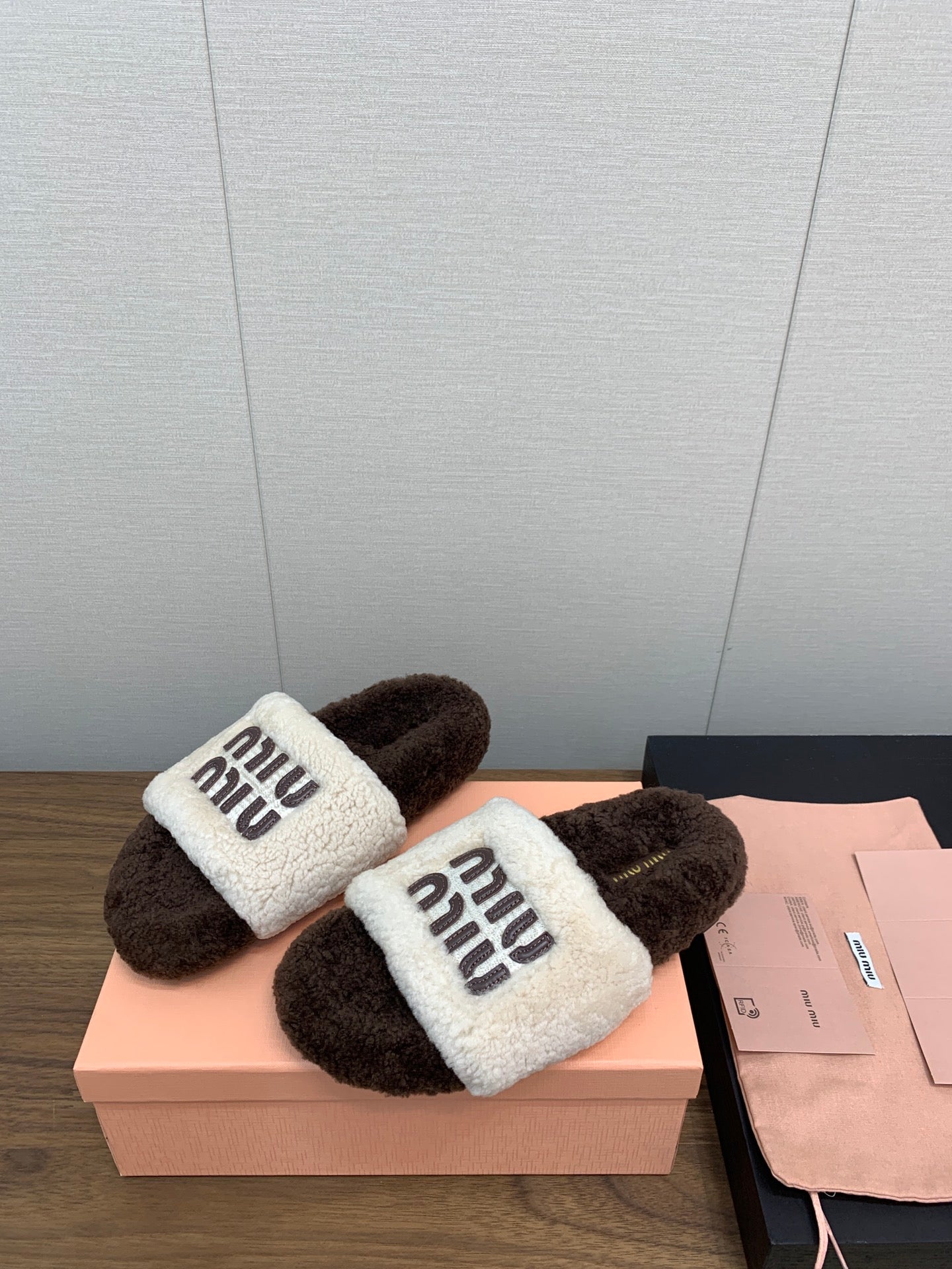 Miu Slippers Brown Mixed With White With Brown Lettering Pure Wool