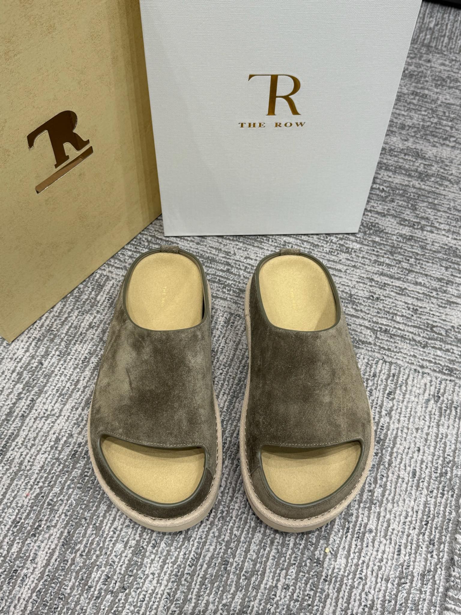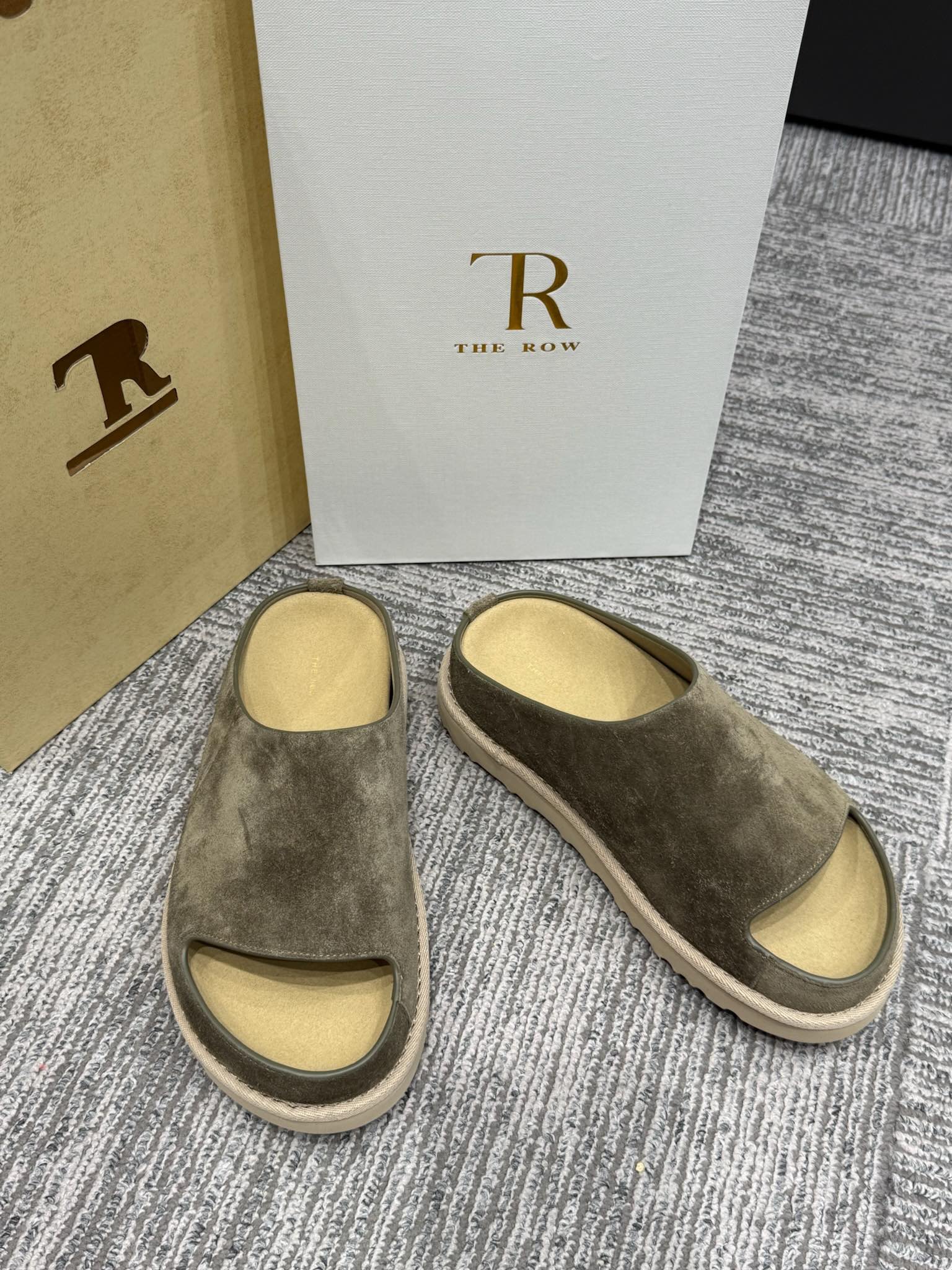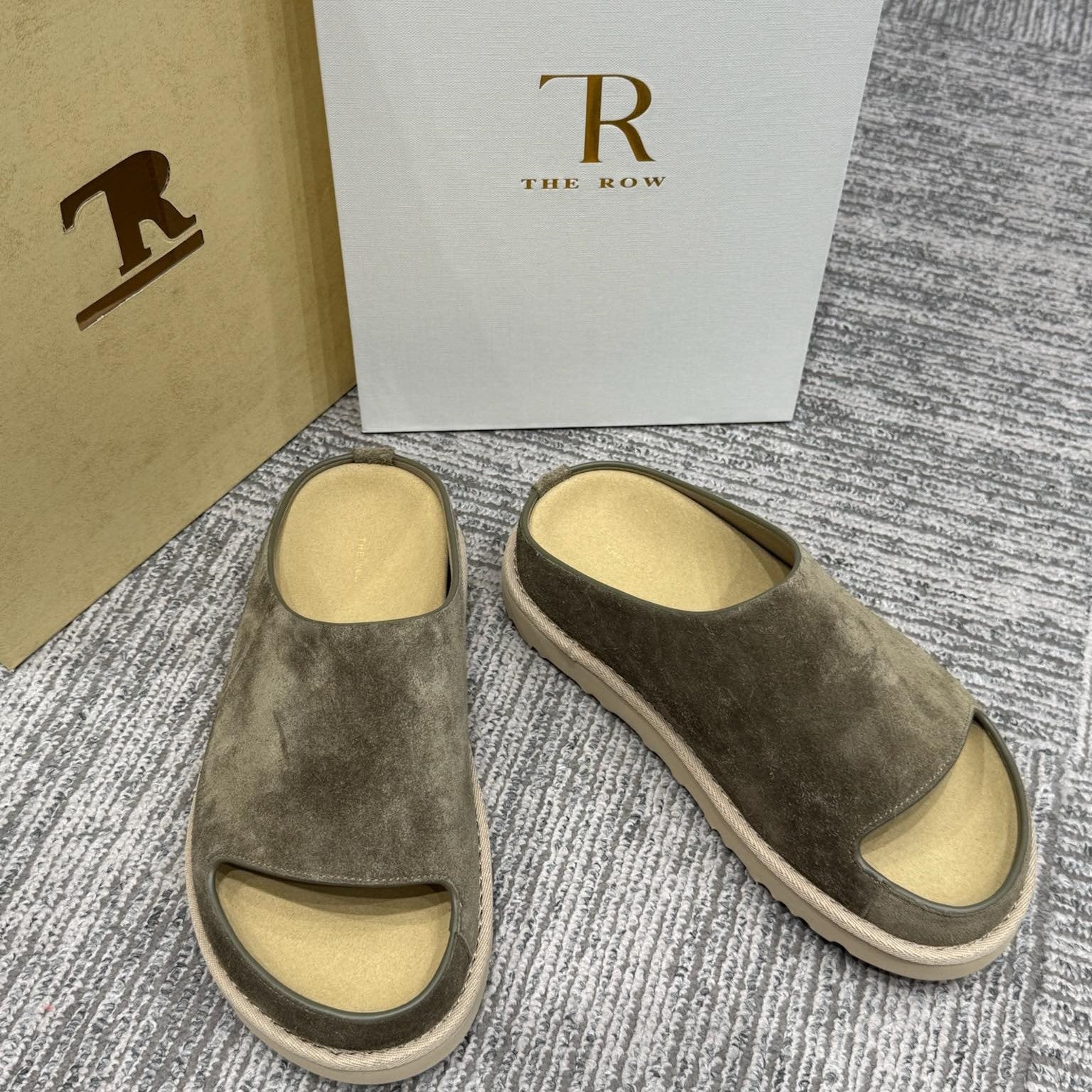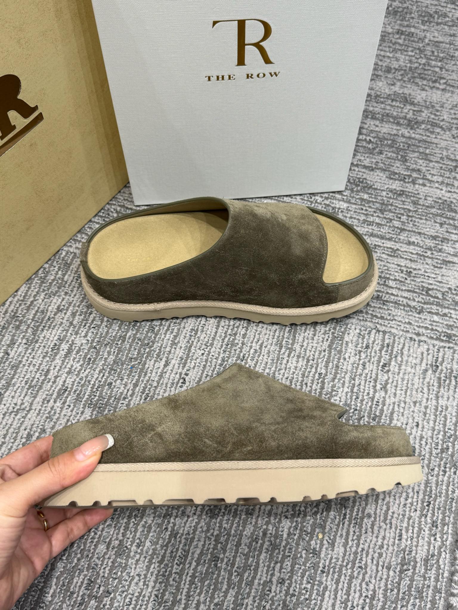 The Row Slide Sandals Olive Green Cow Suede 337473